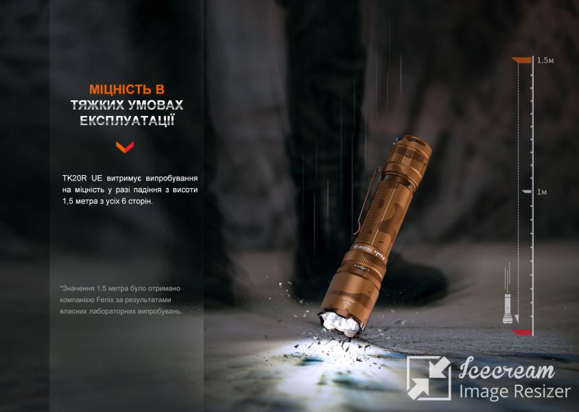 Корпус Fenix TK20R UE имеет размеры 153.7 х 34 х 25.4 миллиметра. Он изготовлен из стойкого к повреждению алюминия A6061-T6 с покрытием в виде анодирования премиального класса, защищающего материал от царапин. Металл имеет ряд преимуществ: он не поддается ржаванию, быстро остывает и противостоит деформированию при ударе о твердую поверхность после падения с полутораметровой высоты.