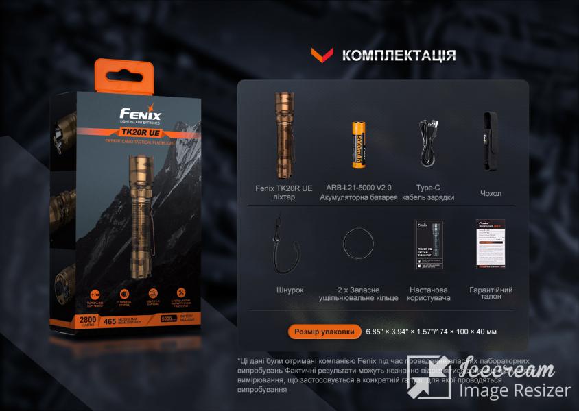 Фонарь Fenix TK20R UE, аккумулятор ARB-L21-5000 V2.0, кабель USB Type-C для подзарядки, два запасных уплотнителя, темляк, чехол, инструкция пользователя, гарантийный талон.