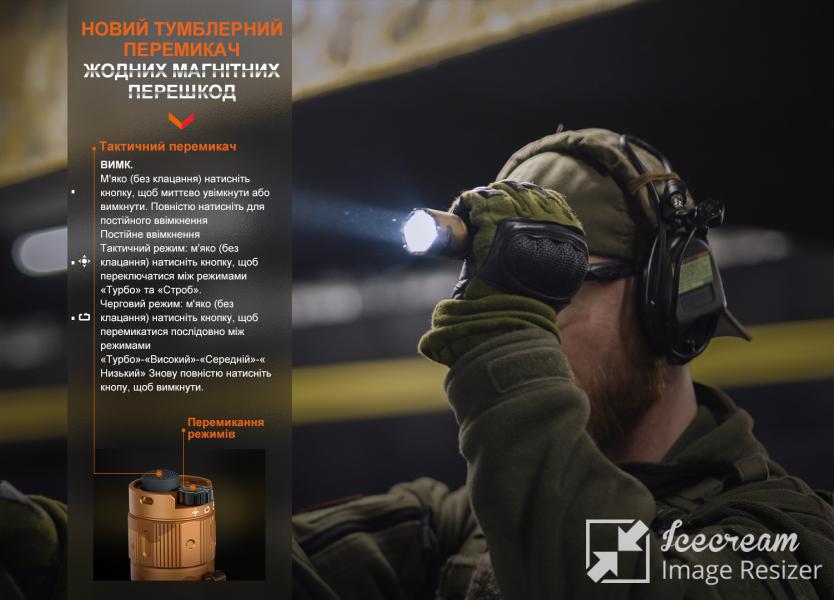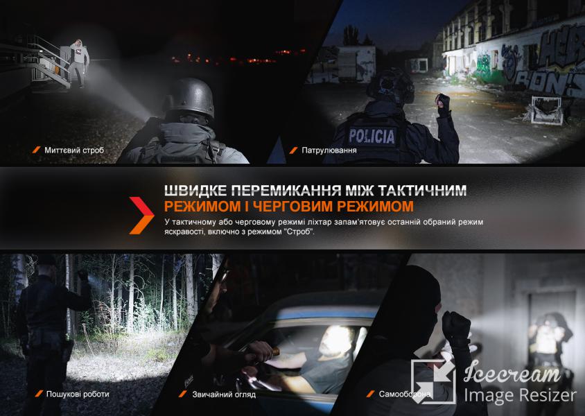 По выбору пользователя доступны две отдельные группы режимов. В тактическую группу входит несколько основных вариантов освещения: Турбо и мерцающий стробоскоп, предназначенный для моментальной дезориентации противника, а также подходит для подачи световых сигналов. Служебная группа включает четыре режима с постоянным освещением мощностью от 30 люменов и выше.