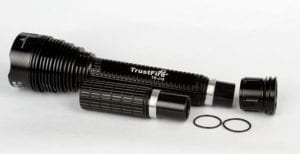 Фонарь имеет гладкий рефлектор и пять режимов работы. В качестве элементов питания светодиодный фонарь TrustFire TR-J18 может использовать как три литиевых Li-Ion аккумулятора 18650/26650, так и два литиевых Li-Ion аккумулятора типа 18650/26650 (есть переходник под аккумуляторы типа 18650 и съемный удлинитель аккумуляторного отсека). Если Вы хотите кого-то удивить мощным световым потоком, то этот фонарь именно то что нужно. Отлично используется как фонарь для охоты, рыбалки или повседневной жизни.