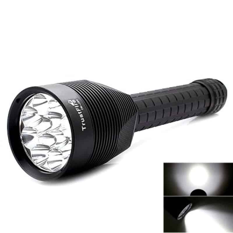 Стремясь быть первыми создан не имеющий аналогов по яркости светодиодный фонарь компании TrustFire J20. Компания заявляет о лучшей мощности света из ручного фонаря в 13000 люмен! Это было достигнуто благодаря равномерному распределению 12 американских светодиодов в гладком зеркальном отражателе, которые зажигаются от 3 сильных , энергоёмких аккумуляторов 32650 или 26650 на выбор. Фонарь очень популярен на речных — морских суднах и пограничных постах.