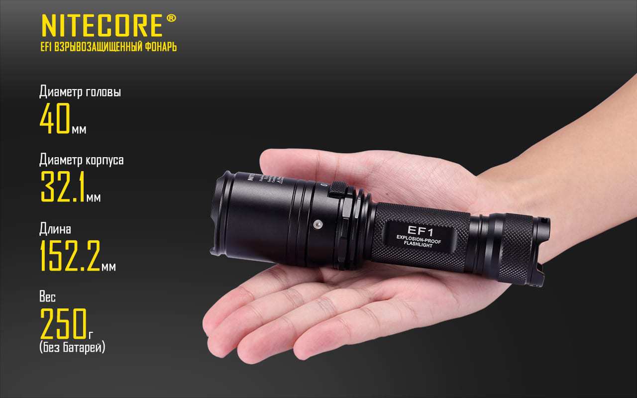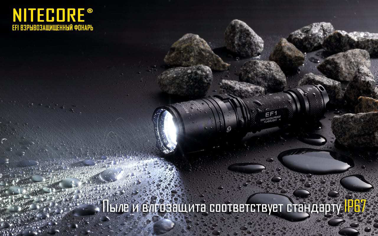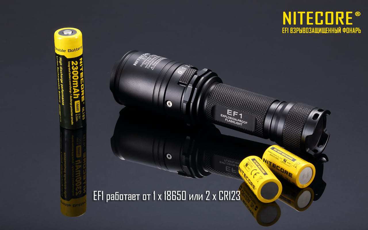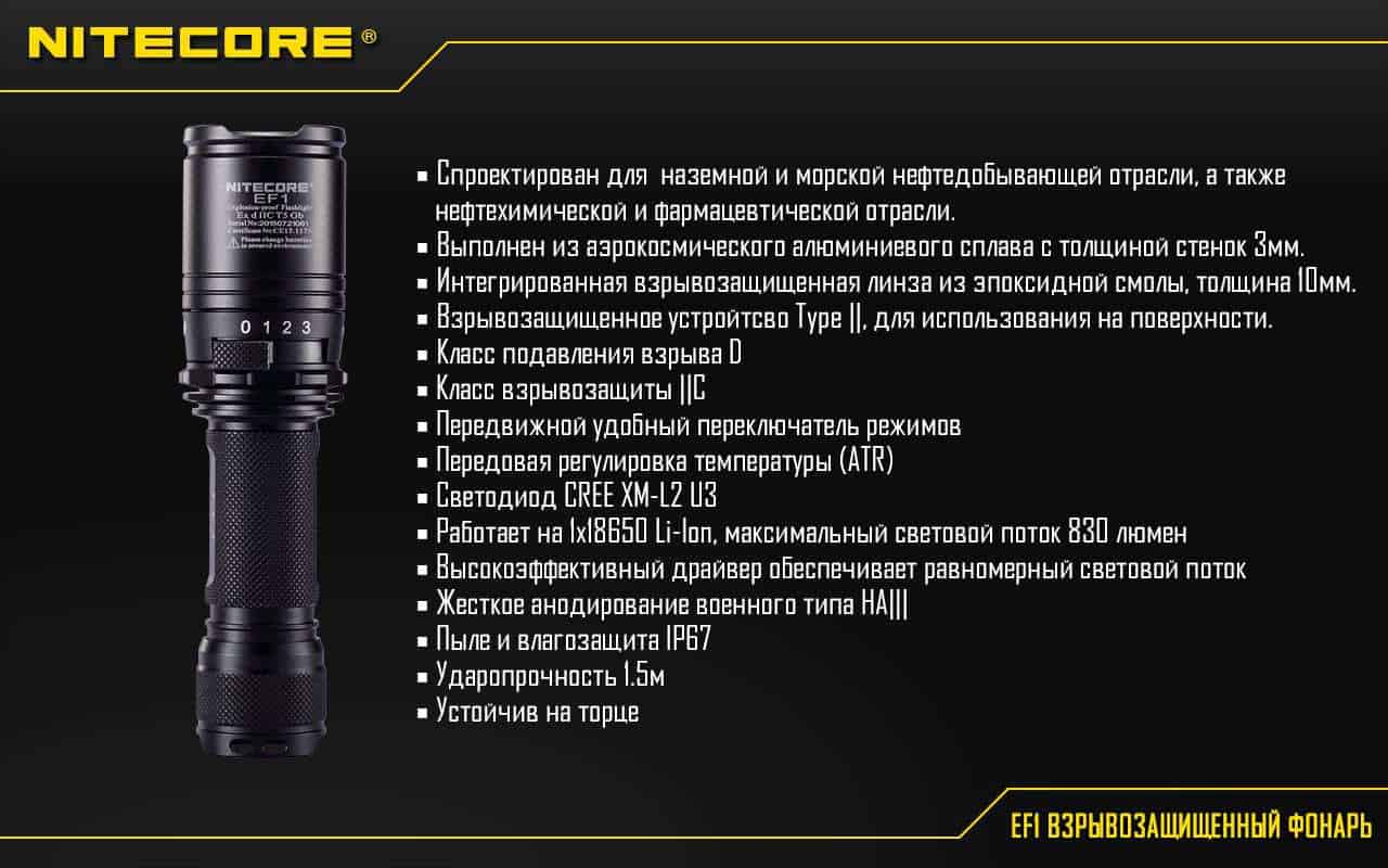 Фонарь Nitecore EF1 предназначен для применения во взрывоопасных газовых средах. Степень защиты по PCEC обеспечивает сдерживание возможного взрыва непосредственно в корпусе фонаря без распространения взрыва и повреждения самого корпуса. Источником света выступает один светодиод CREE XM-L2 U3 с максимальным световым потоком 830 люмен. Класс защиты самой оболочки IP67 предполагает краткосрочное погружение в воду на глубину до 1 метра, длительное погружение не рекомендуется.