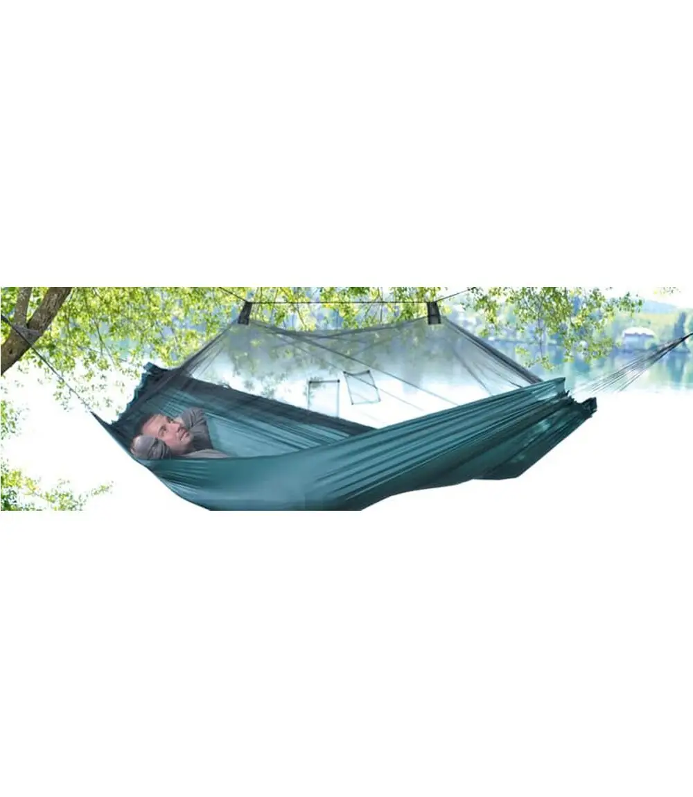 Легкий гамак с антимоскитной сеткой, крепко пришитой к одной стороне закрывающегося на молнию гамака с другой стороны. Гамак изготовлен из прочной и воздухопроницаемой ткани. Если москитная сетка не нужна – гамак можно просто перевернуть.