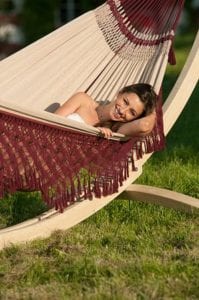 Изюминкой данной модели является отделка краев кружевами ручной работы. Изящные кружева гармонично сочетаются с бразильским макраме, которое соединяет сукно для лежания и канаты для крепления. Украшенная бахромой плетеная сеть – это не только эстетическое украшение, но и практичное решение, так как прочная сетка обеспечивает равномерное распределение массы тела по всему сукну. Сочетание насыщенного цвета бордо и легкого лилового цвета придает дизайну изысканность и подчеркивает отменный вкус владельца.