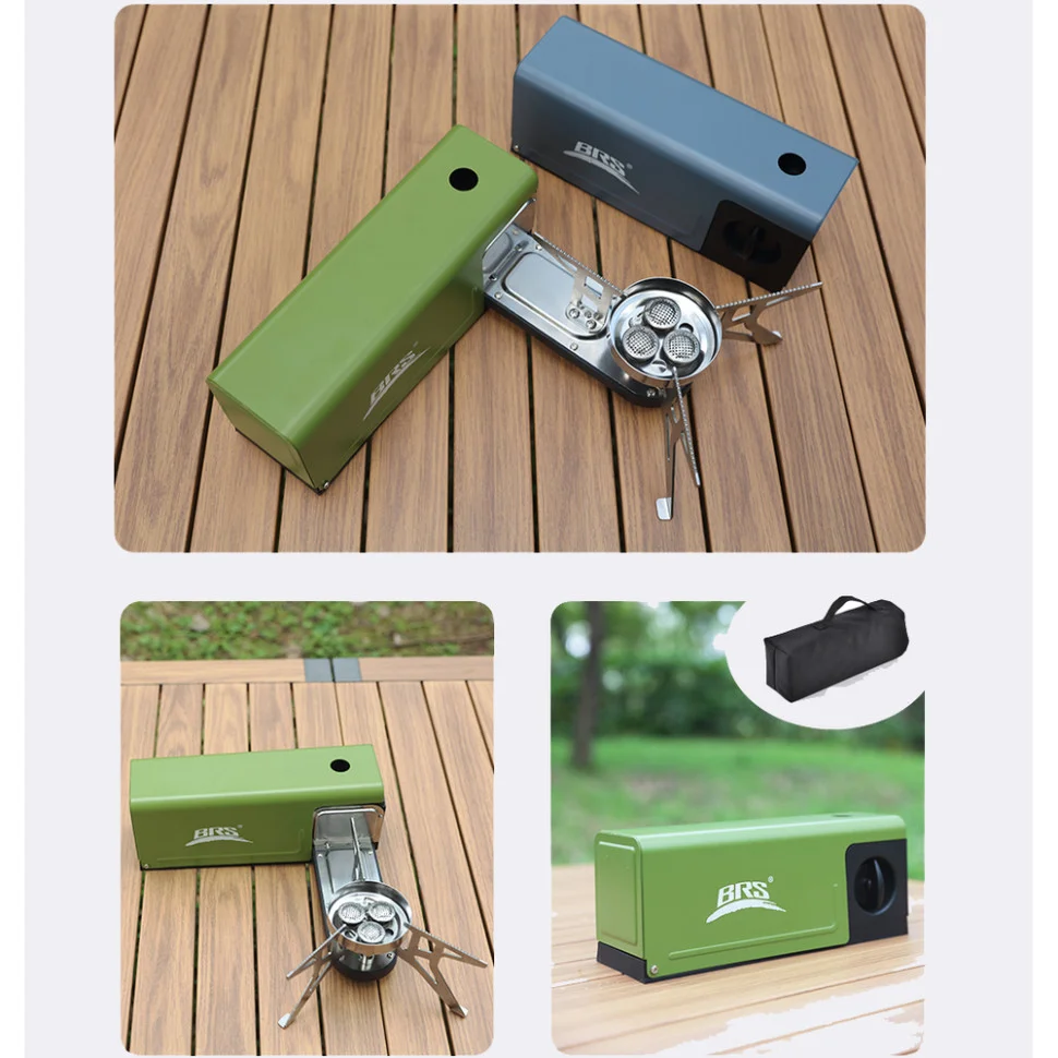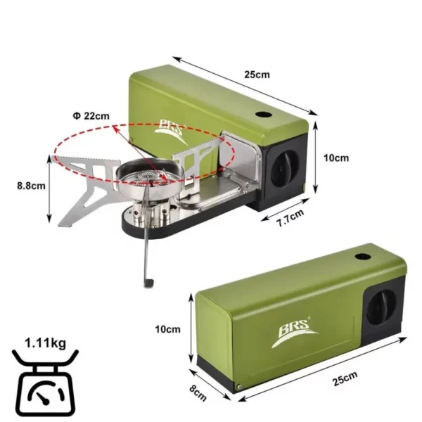 Горелка BRS-97 активируется методом пьезоподжигания и имеет встроенную ветрозащиту, чтобы сильные порывы ветра не гасили пламя. Складные зубчатые подставки позволяют устанавливать на конструкцию производную посуду диаметром от 100 до 260 мм.