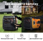 • Электрический запуск/дистанционный запуск: быстро и легко запустите двигатель, нажав кнопку. Вы также можете легко запустить или выключить портативный генератор с помощью дистанционного брелка.