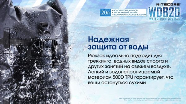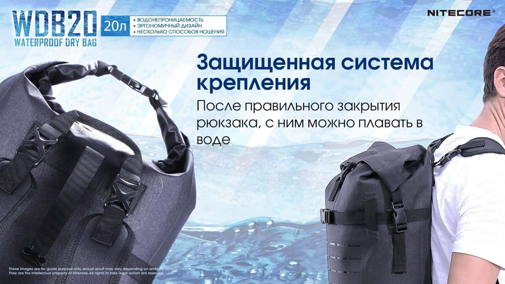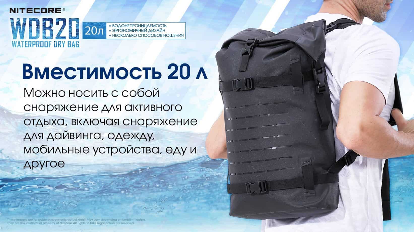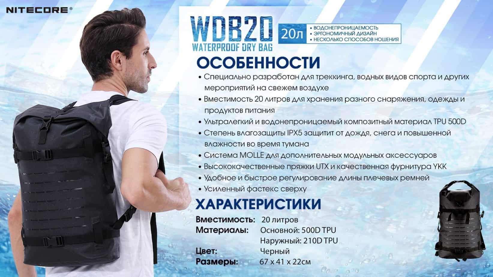 Nitecore WDB20 — это универсальная модель рюкзака обладающая сравнительно большим основным отделением имеющего объем 20 л. Помимо сравнительно большого объема отделения, рюкзак является ещё и полностью влагозащищенным.