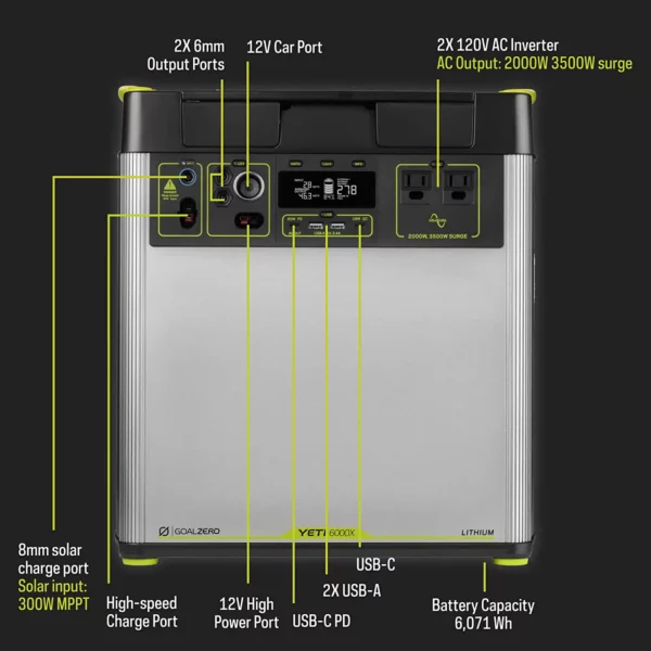 Электростанция Goal Zero Yeti 6000X предоставляет вам большие возможности. Оснащенный сетевой розеткой 230 В, 12 В и 4 USB-портами (2 x USB-A, 1 x USB-C и 1 x USB-PD), станция может обеспечить питание всем необходимым устройствам. Вы можете питать 12 устройств одновременно! Бытовая техника, бытовые приборы, газовые плиты, медицинское оборудование и даже электроинструменты. Все они созданы по системе Plug&Play, так что все о чём вам нужно позаботиться — это вставить штекер в соответствующий порт.