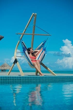 Разработанный и запатентованный фирмой LA SIESTA встроенный вертлюг обеспечивает дополнительный комфорт и безопасность. Он позволяет вращаться по оси. При этом шнуры для подвешивания не переплетаются.