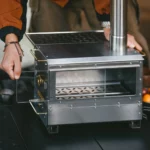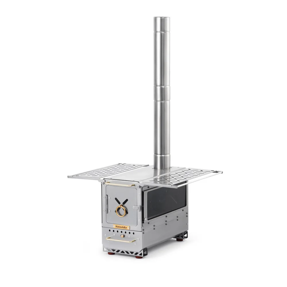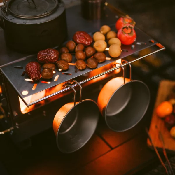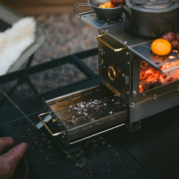 Для работы печи используются дрова, которые закладываются через боковую дверцу с ручкой-кольцом. На двух складных подставках легко разместить туристическую посуду или пищевые продукты. Таким образом, вы можете одновременно кипятить воду, готовить горячие блюда и запекать овощи. Импровизированные ручки на подставках позволяют подвешивать мелкие принадлежности, добавляя удобства во время приготовления и позволяя держать все необходимое под рукой.