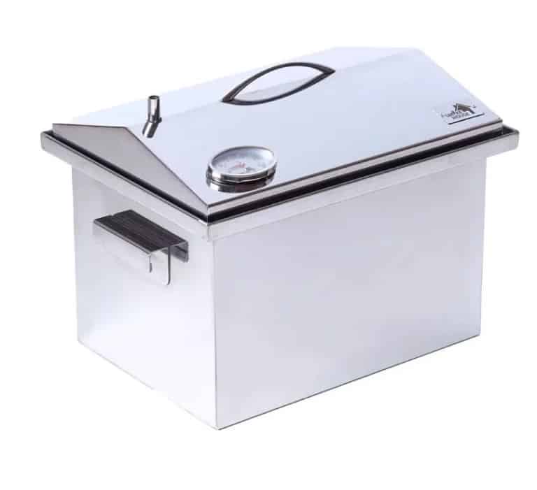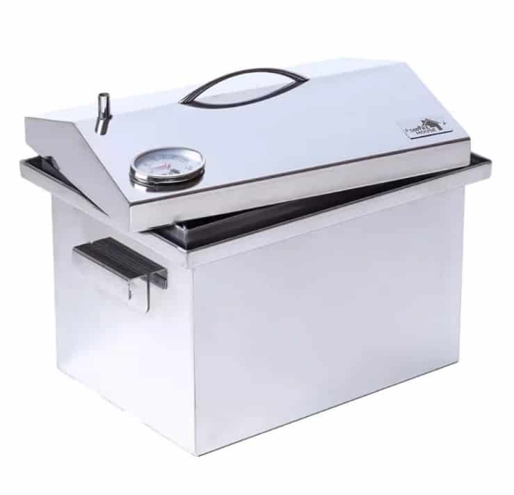Крышка, выполненная в виде домика, позволяет коптить продукты и на решетках, и в подвешенном состоянии. Особенностью устройства является наличие встроенного термометра, который регулирует процесс приготовления. Благодаря герметичной крышке коптильня максимально качественно выполняет свою работу. Образующийся дым отводится через специальную систему.