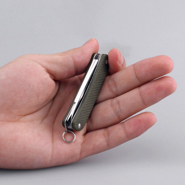 Ручка ножа сформирована двумя накладками из G10, прикрученными к стальному основанию. Они неровные снаружи, чтобы в мокрых руках нож не стал проскальзывать. Цвет ручки покупатель выбирает из трех доступных вариантов: зелёного, черного и коричневого. С одной стороны ручки прикручена клипса, также сделанная из стали, чтобы нож можно было закрепить в кармане. А на торце есть металлическое кольцо, к которому вполне можно прикрепить темляк.