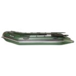 BARK BТ-290 — универсальная двухместная моторная надувная лодка с реечным настилом. Модель пользуется большой популярностью у любителей рыбной ловли, водного туризма и охоты. Лодка изготовлена из специализированного, многослойного, армированного ПВХ плотностью 950 гр/м2. Минимальная осадка надувных моторных лодок обеспечивает хорошую ходкость и высокую маневренность на воде. Материал надувных баллонов имеет матовый, светло-зеленый цвет. Цвет днища — черный. Подобное цветовое исполнение существенно упрощает уход и позволяет изделию сберечь внешний вид на длительное время. Носовая часть судна — заостренная и приподнята над поверхностью воды. Такая форма корпуса обеспечивает хорошую мореходность и уменьшает забрызгивание кокпита при волнении. Для безопасности и удобства пассажиров борта судна оборудованы леерной веревкой и привальным брусом. Привальный брус выполнен из прочной резины и имеет Т-образный профиль. Он расположен на внешней части баллонов, выше ватерлинии судна. Привальный брус обеспечивает дополнительную защиту баллонам от механических воздействий, а так же выполняет роль брызгоотбойника. Размеры кокпита достаточны для комфортной рыбалки в одиночку или прогулок экипажем до двух пассажиров. Надувная лодка БАРК BT-290 оснащена стационарным транцем, на который можно установить бензиновый двигатель или электромотор мощностью до 8 л.с. Диаметр баллонов, составляющий 36 см, обеспечивает грузоподъемность судна в 320 кг, а три раздельных гермоотсека способствуют высокой степени безопасности на воде. Даже в случае повреждения одного из баллонов плавсредство будет удерживать на воде заявленный в характеристиках вес, что позволит безопасно добраться до береговой линии.