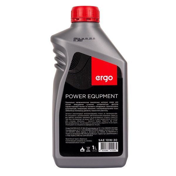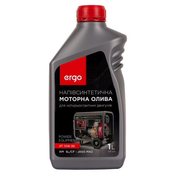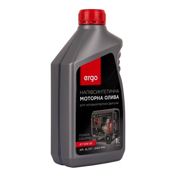 Бренд ERGO предлагает полусинтетическое всесезонное моторное масло стандарта 10W-30 для дизельных и бензиновых четырехтактных двигателей, которое обеспечивает легкий старт и эффективную смазку в двигателях генераторов даже в условиях низких температур.