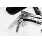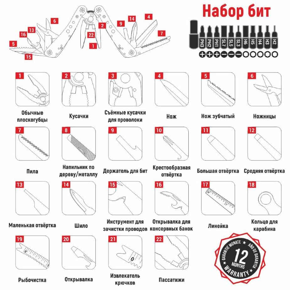 Размер инструмента – 10,5х5см. Толщина – 1,5 см. При этом комплектность мультитула составляет 22 инструмента, что делает его многофункциональным и при этом по-настоящему эргономичным.