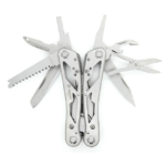 В комплект входят следующие предметы: подпружиненные плоскогубцы с кусачками, два лезвия, одно из которых имеет серейторную заточку, плоская отвертка небольшого размера, ножницы, ножовка по дереву, зенки, удлинитель адаптера для бит открывалки для бутылок и консервов.