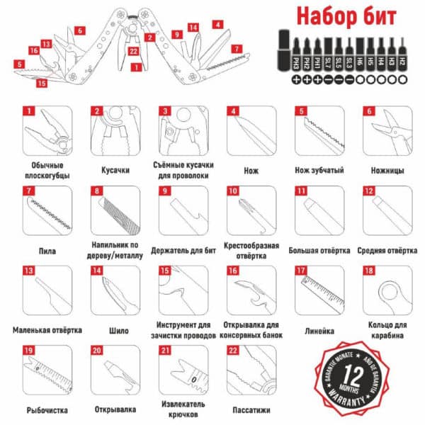 - Инструменты пила, серрейторный и обыкновенный нож, миниатюрные ножницы, открывалка, шило,