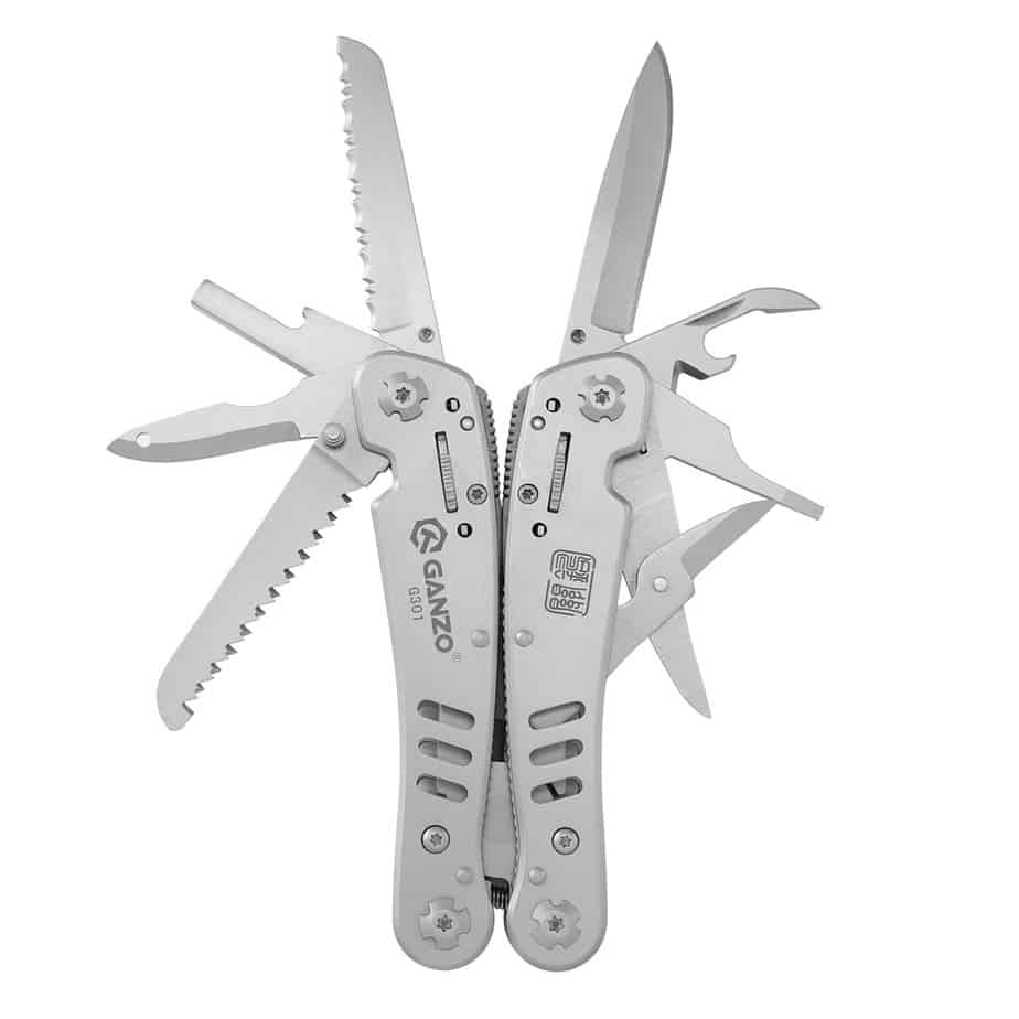 Удобный полноразмерный мультитул G301 от компании Ganzo. Большой набор инструментов позволяет использовать модель G301 для полноценного ремонта различных техник. В комплект мультитула G301 входят следующие инструменты: подпружиненные плоскогубцы с кусачками, два лезвия, одно из которых имеет серейторную заточку, две плоские отвертки разного размера, пыли по дереву, ножницы, зенковку, удлинитель для адаптера, консервный нож.