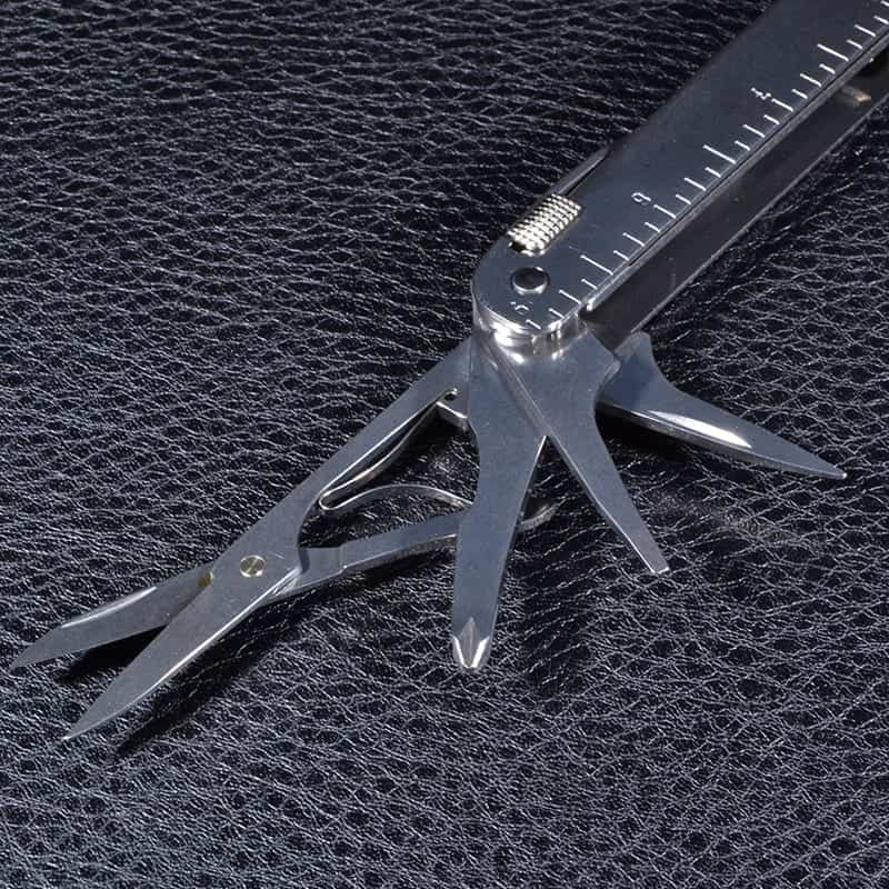 Функции: Нож , Пила по дереву , Пила по металу , Штопор , Консервный нож , Открывалка для бутылок , Ножницы , Набор бит , Отвертка плоская , Плоскогубцы , Кусачки , Линейка , Шило , Напильник , Стамеска , Фомка , Инструмент для сгибания проволоки , Инструмент для снятия изоляции , Кольцо для переноски