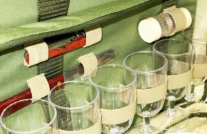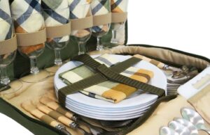В комплект посуды входит: пластиковые контейнеры – 3шт; тарелки — 6шт; бокалы — 6шт; чашки – 6шт ложки — 6шт; вилки — 6шт; ножи — 6шт; нож для хлеба — 1шт; солонка и перечница (2в1) — 1шт; открывашка, штопор, нож (3в1 складной) — 1шт; дощечка для нарезки — 1шт; салфетки — 6шт; скатерть — 1шт; термомешки для бутылок – 2шт.