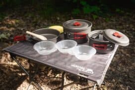 В состав изделий вошел алюминий и огнеупорный пластик, благодаря чему комплект получился прочным и защищенным от внешних факторов. Металлические части посуды выполнены с применением нержавеющей стали, устойчивой к абразивным воздействиям. Рукоять можно составлять при необходимости. Кроме того, емкости обеспечены антипригарным покрытием, что, конечно, очень практично. Посуда имеет прочные крышки. Все продумано до мелочей, чтобы приготовление пищи на природе не было связано ни с какими трудностями.