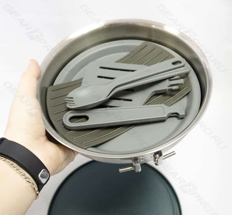 Вес всего набора в целом составляет около 1 кг. Все элементы очень легко помещаются внутрь сковородки и закрываются крышкой. Это очень компактный и очень функциональный набор, так как все элементы найдут применение во время вашего отдыха на природе.
