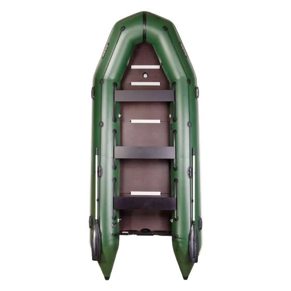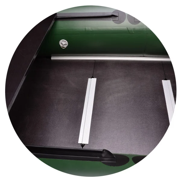 Судно имеет все необходимое оборудование для комфортной эксплуатации. Лодка комплектуется стационарным транцем, надувным килем, жестким настилом, передвижными сидениями, уключинами поворотного типа и разборными веслами длиной 1,8м. Для безопасности и удобства пассажиров на бортах установлены привальный брус и леера.