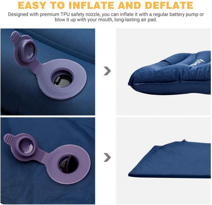 Размер в разложенном виде 198 х 138 см, вес всего 3б5 кг, легкий и портативный, идеально подходит для кемпинга на открытом воздухе, пеших прогулок, походов или приема гостей. Благодаря встроенному ножному насосу этот надувной матрас для кемпинга невероятно легко надуть. Таким образом, вы можете надуть свой матрас для кемпинга всего за несколько минут. Больше не нужно надувать матрас ртом или использовать дополнительный насос. Матрас изготовлен из полиэстера 190T, он может выдерживать до 100 кг. Благодаря материалу надувной матрас для кемпинга водонепроницаем, устойчив к проколам и растяжению, экологически безопасен и долговечен. Компактная и портативная сумка для переноски: к этому матрасу прилагается сумка для переноски и 2 ремонтных комплекта. Очень удобно брать с собой куда угодно.
