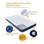 Размеры матраса 188 × 99 × 22 см. Подходит для всех возрастных групп, размеры упаковки 28 × 21 × 21 см, вес 2,1 кг. Промышленный дизайн с 32 внутренними воздушными змеевиками для дополнительной прочности и поддержки. Ваша надувная кровать остается плоской и твердой, поэтому вы можете спать спокойно. Флокированная поверхность премиум-класса, приятная для кожи, для более спокойного сна. Водонепроницаемый флокированный верх сохраняет поверхность сухой, а нижняя сторона из нескользящего материала предотвращает нежелательное скольжение. Материал легко чистится после использования, просто протирая влажной тканью. Встроенный высококачественный пенный насос быстро надувает или сдувает надувной матрас до желаемой плотности примерно за 8 минут. Убедитесь, что клапан 2-В-1 полностью закрыт для надувания или полностью открыт для спуска. В комплект входит прочная оксфордская сумка для удобного хранения и транспортировки. Просто сложите, сверните и положите спущенный надувной матрас в сумку для переноски, чтобы упростить хранение и транспортировку.