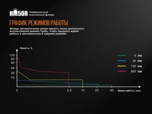 Модель HM50R сделана налобной, а кроме того, в этом фонаре учтены все возможные моменты, касающиеся его долговечности, надежности и защищенности от внешнего воздействия. Буквально все детали — высококачественные и очень долговечные. Так, здесь установлен диод с запасом работоспособности 50 тысяч часов — новая модель XM-L2 U2от известного бренда Cree. Такой диод обеспечивает фонарю яркость до 500 люмен и позволяет ему работать в четырех режимах. Каждый из режимов представляет собою определенный уровень яркости, тактических вариантов освещения для данной модели не предусмотрено. При максимально доступной яркости, луч фонаря будет освещать территорию радиусом до 80 метров. Минимальная яркость (4 люмена) позволит освещать пространство на 6 метров вдаль. Промежуточные режимы дают 130 люмен света с дистанцией освещения 42 метра и 30 люмен с дистанцией 20 метров. Так что HM50R будет удобно использовать и во время движения на открытых участках территории, и во время отдыха в палатке.