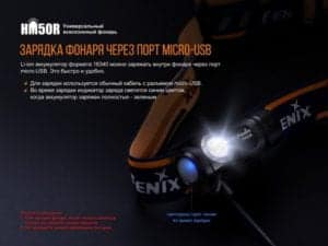Производители позаботились о том, чтобы использовать данный фонарь было удобно буквально в любых условиях. Он очень легкий и весит лишь 63 грамма. Наголовное крепление легко подгоняется под нужный размер, а кроме того, на нем есть неширокая силиконовая полоска, которая предотвратит попадание пота со лба в глаза. Управление фонарем HM50R осуществляется одной кнопкой. Она располагается в торце корпуса. Модель HM50R защищена от переполюсовки и замыканий, от перегревания (при достижении 65°С фонарь самостоятельно уменьшит яркость). Кроме того, чтобы в выбранном режиме фонарь мог проработать дольше, со временем яркость света снизится на несколько люмен. Тот режим, что использовался непосредственно перед выключением фонаря, останется в его памяти, чтобы активироваться при следующем включении. В данной модели имеется и индикатор заряда. Чтобы его включить, нужно нажать на кнопку отключенного фонаря и посмотреть, какой сигнал будет ответным. Если индикатор начнет светиться зеленым цветом, то аккумулятор практически полный (более 80%). Если зеленый свет будет мигающим, то уровень заряда оценен в 50-80%. Если постоянно светиться будет синий свет, то заряда осталось 20-50%. Если же и синий будет мигать, то в аккумуляторе осталось менее 20% заряда.