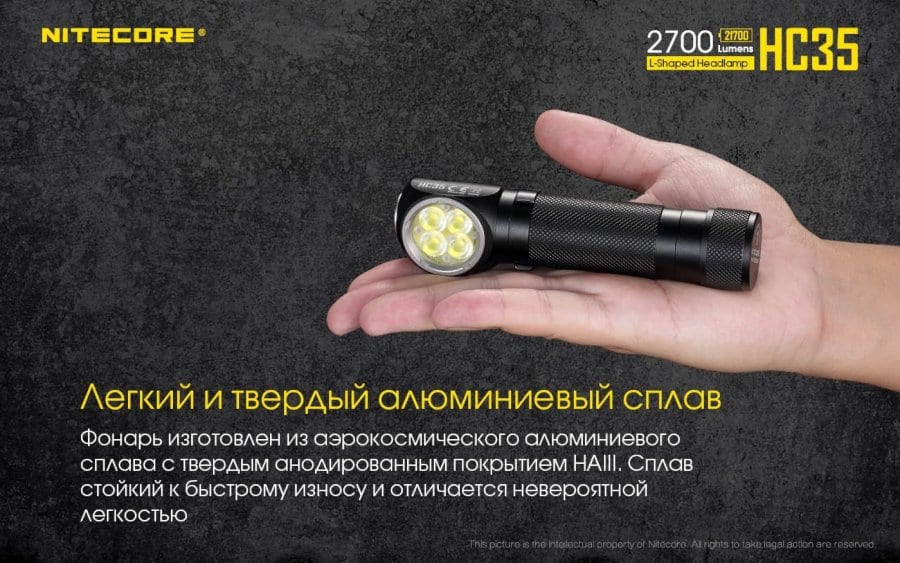 Корпус произведён из фрезерованного алюминия, это означает легкость фонаря, хорошую прочность и отличное охлаждение налобного фонаря HC35.