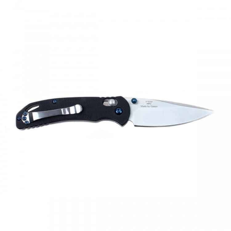 Лезвие этого ножа не боится воздействия воды и приспособлено для работы с большим количеством материалов разной твердости. Оно сделано из сплава 440С, объединившего защищенность от коррозии с довольно высокой твердостью металла. Размер лезвия составляет 77 мм. Оно изготовлено в классической форме clip-point и ровно заточено. Именно такой вариант заточки не только считается универсальным, но и легче всего подтачивается в походных условиях. Нож отполирован по методу satin wash, из-за чего на клинке заметны штриховые следы от прохода абразивом.