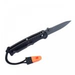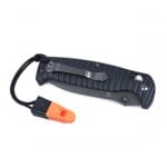 Вместе с рукояткой это значение увеличивается до 205 мм. Изготовлена рукоятка из хорошего по качеству стеклопластика. Его композитная структура делает этот материал намного более прочным, нежели используемые ранее аналоги. Накладки окрашиваются в оранжевый или черный цвет. Их поверхность — не ровная, чтобы нож не выскальзывал из рук. А дополнительно зафиксировать его в ладони поможет темляк. Дополнительный аксессуар — свисток — также крепится к темляку.