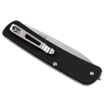Накладки на рукоять изготовлены из износостойкого полимерного материала G10, славящегося своей прочностью и долговечностью. А благодаря фактурной поверхности и эргономичной форме рукояти, модель L11 удобно удерживать практически любой хват. В ассортименте нашего интернет-магазина представлены три вариации данного ножа: с черными, коричневыми и темно-зелеными накладками на рукоять.