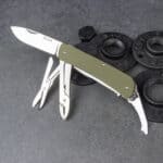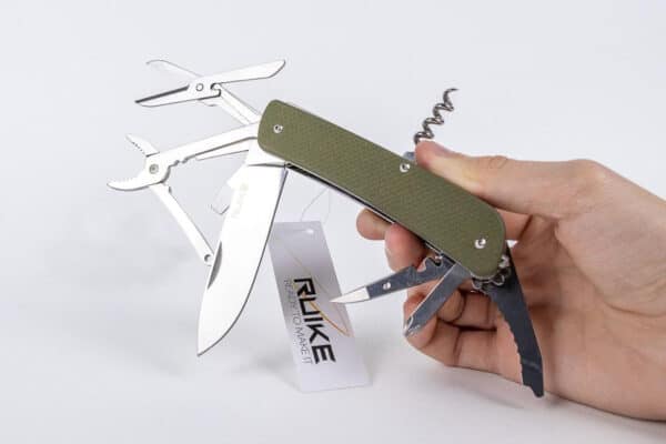 Для туристических целей как нельзя лучше подходит именно складной нож. Его удобно транспортировать, безопасно использовать. Но особенно практичны для рыбаков и туристов многофункциональные модели, как, например, Ruike L41. Это качественный нож с хорошо продуманным набором функций. Он состоит сразу из нескольких инструментов с одной общей рукояткой, которые можно использовать поочередно. Но главным среди них именно нож. Размер лезвия этого ножа составляет по длине 85 мм. Толщина клинка по обуху не превышает 3 мм. Вся его режущая кромка гладко заточена, что делает нож универсальным в работе с разными материалами. Кроме того, ухаживать за хорошо заточенным ножом проще, чем за серрейторным лезвием.