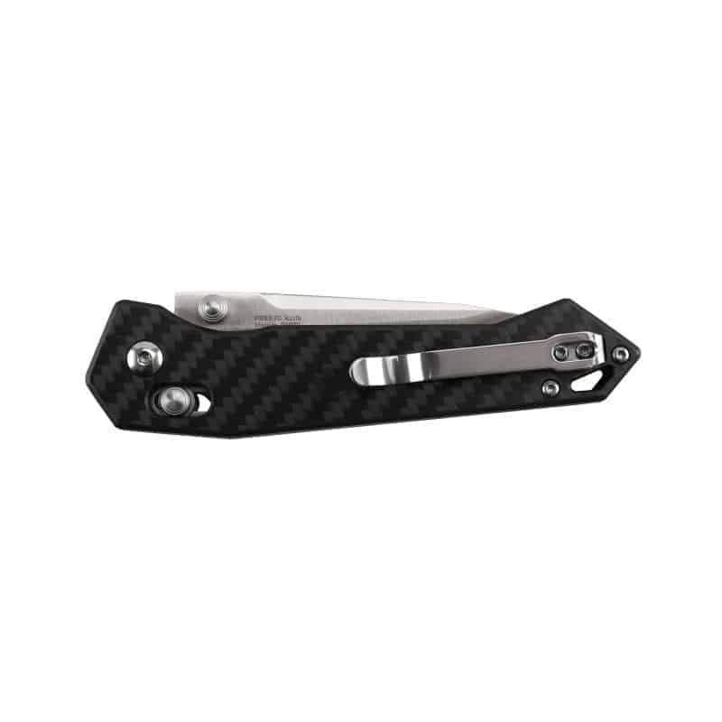 Клинок извлекается из ножа при помощи стандартных стальных шпеньков и фиксируется фирменным замком, именуемым Axis Lock. За скорость и плавность флиппования отвечают осевые подшипники. Форма клинка clip-point является очень удобной для решения самых разных задач в повседневном быту. Достаточно популярны ножи с подобным типом профиля среди охотников и любителей экстремальных видов отдыха.