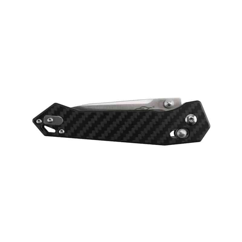 Рукоятку модели формируют стальные лайнеры, полимерный спейсер и накладки из материала Carbon fibre, которые фиксируются стальными болтами под торкс. В дизайне рукояти предусмотрена съемная клипса из стали. Есть большое отверстие под темляк. Полная длина рукояти – 11,6 сантиметра.
