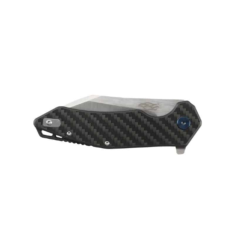 Рукоятка ножа FirebirdFH31 CF состоит из стальной полосы и пара накладок из углеволокна. Данный материал имеет композитную структуру, за счет чего отличается очень большой прочностью и длительным сроком эксплуатации. При этом вес углепластика сравним обыкновенным пластиком. Он также не впитывает воду и невыцветает на солнце. На ручке ножа размещена прижимная клипса, а также есть небольшое отверстие, чтобы можно было продеть темляк.