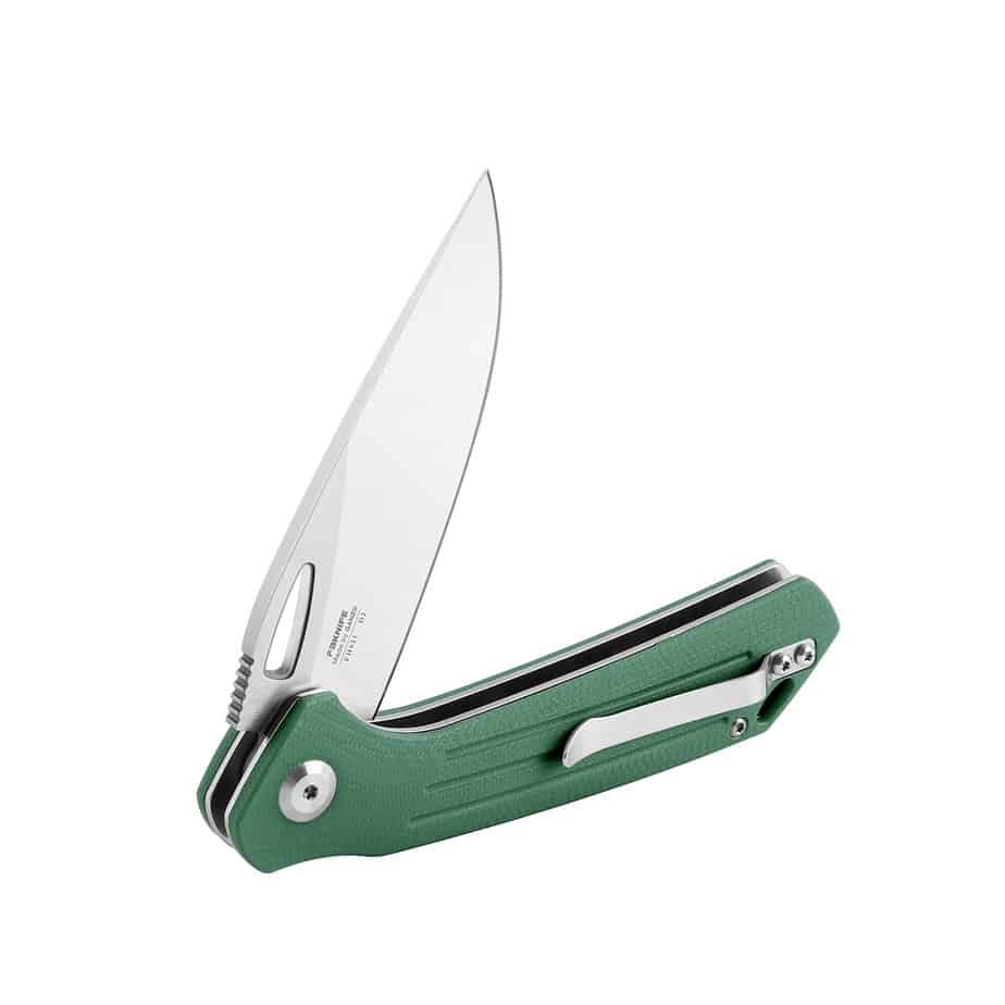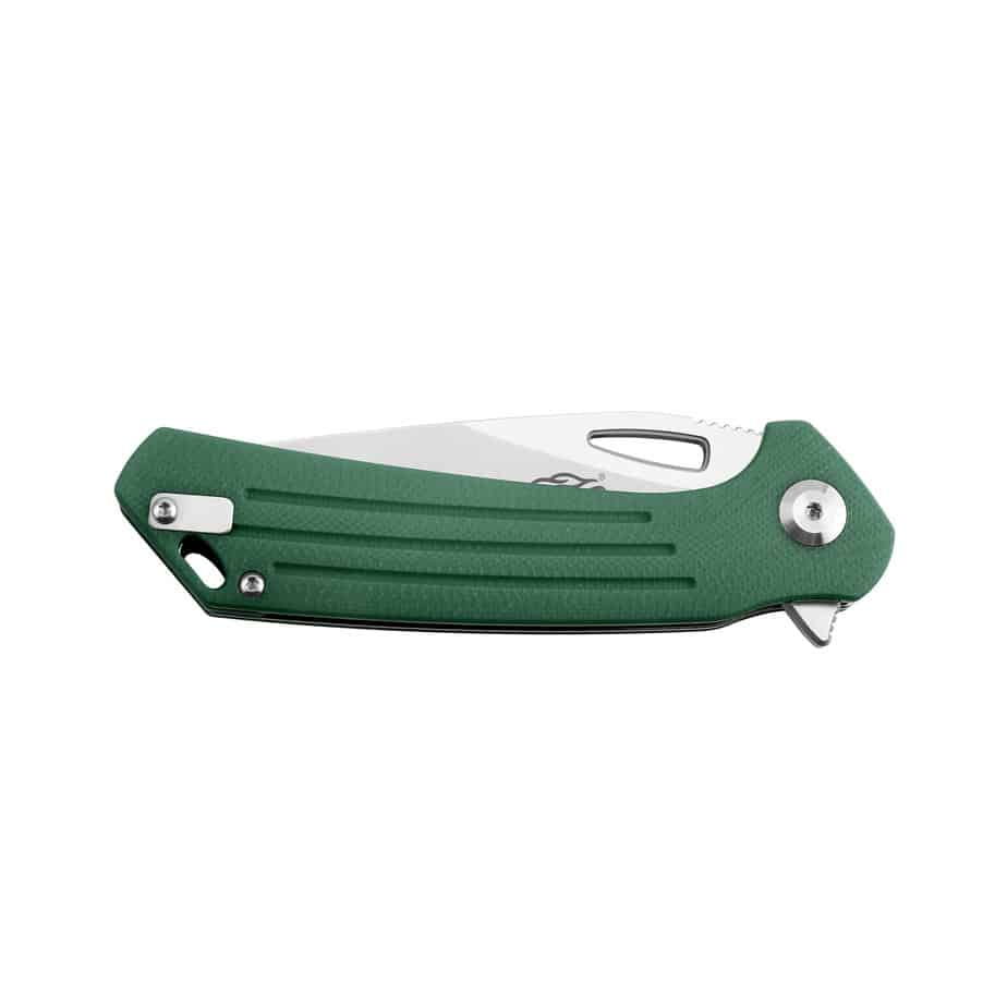 Чем складной Ganzo Firebird FH921 представляет собой карманное изделие, рассчитанное, в том числе, на использование в туризме. Особенность данной модели – в нетипичной форме рукояти, имеющей выемку в верхней части ближе к обуху. Насечки на обухе способствуют лучшему сцеплению с пальцем пользователя. Другая отличительная черта – отверстие в области клинка на месте, где обычно располагается шпенек. Конструктивный элемент помогает легко открыть изделие рукой. Осевой винт снабжен круглым металлическим подшипником.