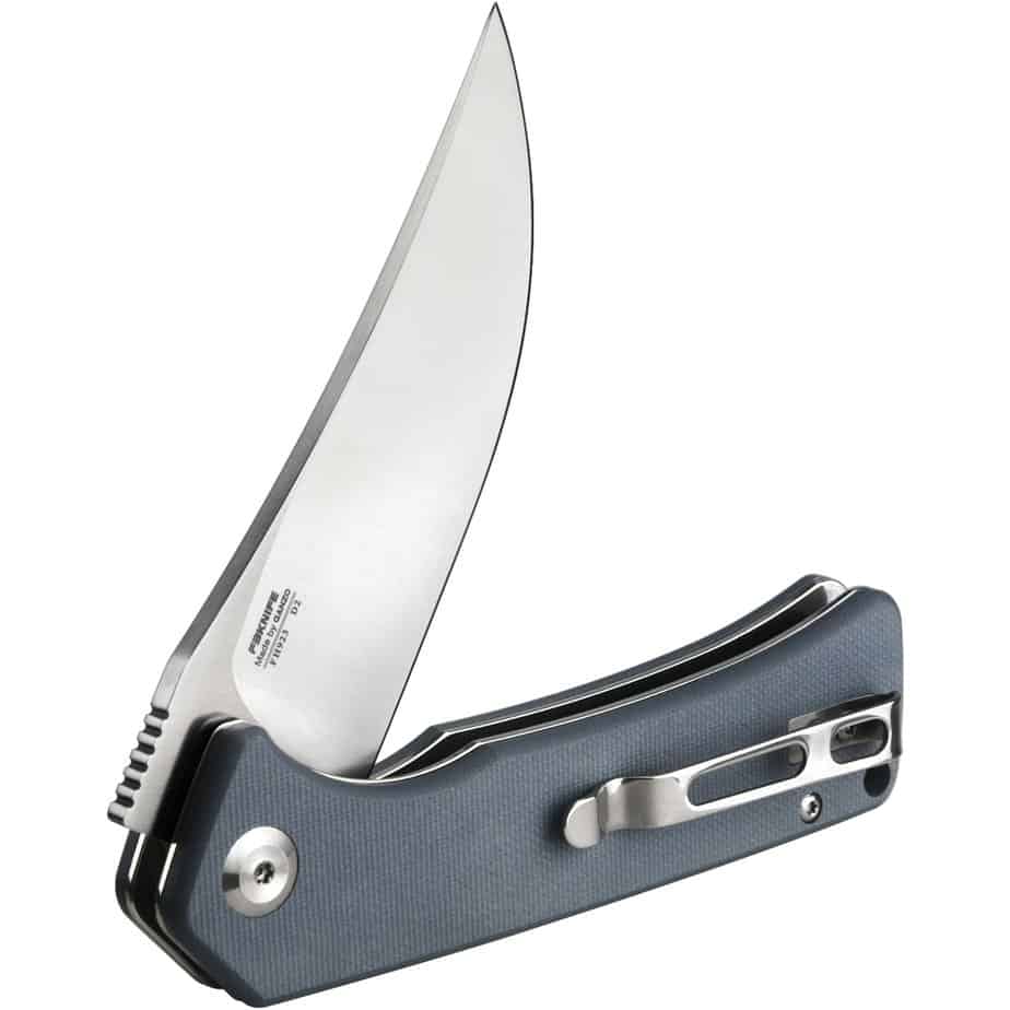 Форма ножа дает эргономику применения, а его клинок универсален в использовании. Тип лезвия-drop-point. Для нарезки и накаливания одинаково эффективен. Можно применять в разных видах работ. Лезвие сделано из стали D2, высокого качества, с защитой от коррозии. Сталь отличается большой прочностью, длительно сохраняет острую режущую кромку. Без проблем подвергается заточке. Кромка получается острой за счет содержания в стали более 0,5% углерода. Для лучшей сопротивляемости коррозии включены легирующие добавки, такие как хром и никель.