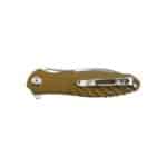Ручка экземпляра сделана из традиционного G10, что придает ей износостойкость, защиту от воздействия высокой температуры, влаги, и устойчивость к повреждениям. Также этот материал, который представляет собой стеклотекстолит, без особого труда окрашивается. Он шероховатый на ощупь. Нож удобно держать в ладони, он не смещается, не скользит. Изделие относится к разряду так называемых флипперов.