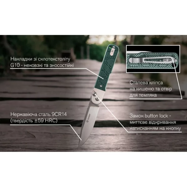 По обе стороны рукоятки закреплены зеленые плашки из стеклотекстолита G10. Благодаря рельефной поверхности, материал не дает ладони скользить по конструкции. Кроме того, этот композит отличается износостойкостью, невосприимчивостью к температурным перепадам и воздействию большинства агрессивных сред, в частности кислот, щелочей и жиров.