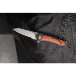Открывать и закрывать нож легко – можно управлять буквально одной рукой. Он безопасен в эксплуатации. Прекрасная механика. Керамический подшипник в конструкции модели обеспечивает более плавное открывание и закрытие лезвия. Ножевой механизм-флиппер. Портативный нож имеет клипсу, с помощью которой можно прикрепить его к карману или подвесить на поясе брюк. Также можно хранить данное изделие в специальном кожаном чехле – и подвешивать за карабин, например, по пояс. Легко хранить и транспортировать. Чехол крепкий и надежный, закрывается на кнопку. Вы всегда сможете комфортно спрятать свой инструмент, не опасаясь того, что он вдруг где-нибудь потеряется.
