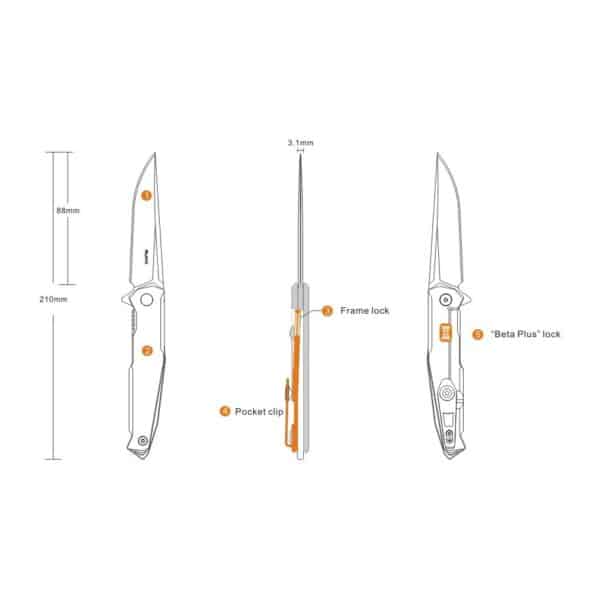 Этот нож небольшой и действительно практичный. В закрытом положении его длина составляет 12 сантиметров, поэтому его удобно брать с собой в походы, на охоту или рыбалку. Но при этом он станет надежным спутником в городе, так как не займет много места в кармане. Закрывается лезвие с помощью механизма Frame Lock, который усилен дополнительным авторским замком Beta Plus, а потому случайное открытие полностью исключено.