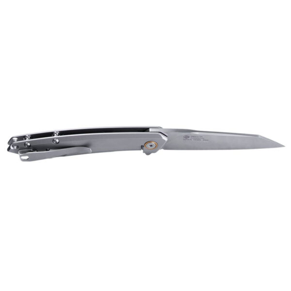 Ручка Ruike P831S-SA также изготовлена ​​из нержавеющей стали, но из другой марки — 3Cr14N. Длина рукоятки достигает 110 мм, обеспечивая комфортное удержание инструмента. С правой стороны конструкции закреплена металлическая клипса, а в хвосте есть круглое отверстие для темляка. Вес модели составляет 93 грамма.