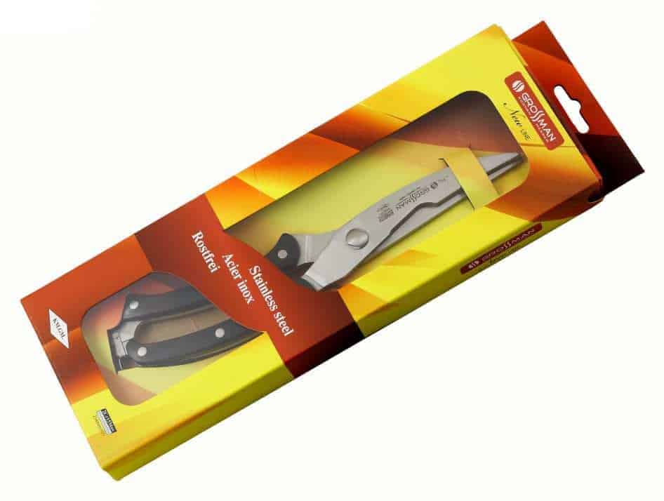Кухонные ножницы, хоть и не являются ножом, явно родственный ему инструмент – они режут. И мало бы о них говорили, если бы они не резали некоторые вещи удобнее ножей. Куриные крылья, плавники рыбы, плотные упаковки… все это работа для кухонных ножниц. Прочные лезвия этих ножниц способны разрезать хрящи и мелкие кости сберегая острые лезвия кухонных ножей. Рукояти этих ножниц цельные, что делает их очень прочными и позволяет без опасений прикладывать большие нагрузки.