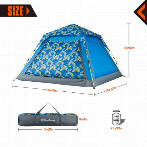 Kingcamp POSITANO вместительная, четырехместная, прочная, легкая палатка для отдыха на открытом воздухе — отличный выбор для семейного кемпинга. Дверной козырек с 2-мя стальными опорами способен защитить внутреннюю часть от дождя, солнечных лучей и пыли, в то же время это отличное место для приема пищи. Размер палатки достаточно большой для семьи из 4 человек. Наша палатка многоцелевая, съемная внутренняя часть, которая позволяет использовать внутреннюю часть как беседку. Палатка может твердо стоять на земле даже при сильном ветре. Внутренние карманы используются для хранения мелких предметов. Вы можете повесить лагерный фонарь или фонарик в верхней части палатки.