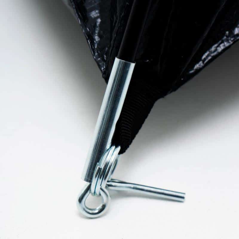 Чтобы облегчить процесс сборки по краям палатки расположены кольца с металлическими вставками в которые фиксируются дуги, что предотвращает неожиданное ускользание.