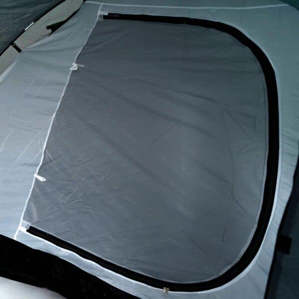 Внутренний щар палатки дополнительно оснащен воздушным клапаном с москитной сеткой. Вход спального отделения продублирован москитной сеткой, можно выбрать или закрыть полностью тканью, или отстегнуть и оставить только москитную сетку, чтобы не было так жарко. В середине есть карман для размещения разнообразных мелочей, вверху — петля для подвешивания фонаря.